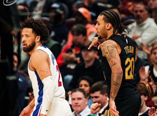 简单回顾一下比赛,米切尔依旧休战,开场泰森+莫布里+阿伦多点开花,哈登反击追身三分打停骑士,骑士依靠杜伦和邓罗内外开花很快追平,双方陷入拉锯战。阿伦和莫布里攻击篮下,哈登突破抛投+底线附近跳投,活塞则依靠康宁汉姆和霍兰咬住比分,第一节活塞27-25稍稍领先骑士。进入第二节,泰森助攻托布轰三分,施罗德喂饼泰森续上三分,喂饼莫布里反击暴扣,泰森和施罗德内外开花,衔接段活塞的进攻完全匹配不上骑士。而且施罗德手感确实不错,等到哈登回来,哈登又开始喂饼梅里尔,后半段双方进攻同时哑火。